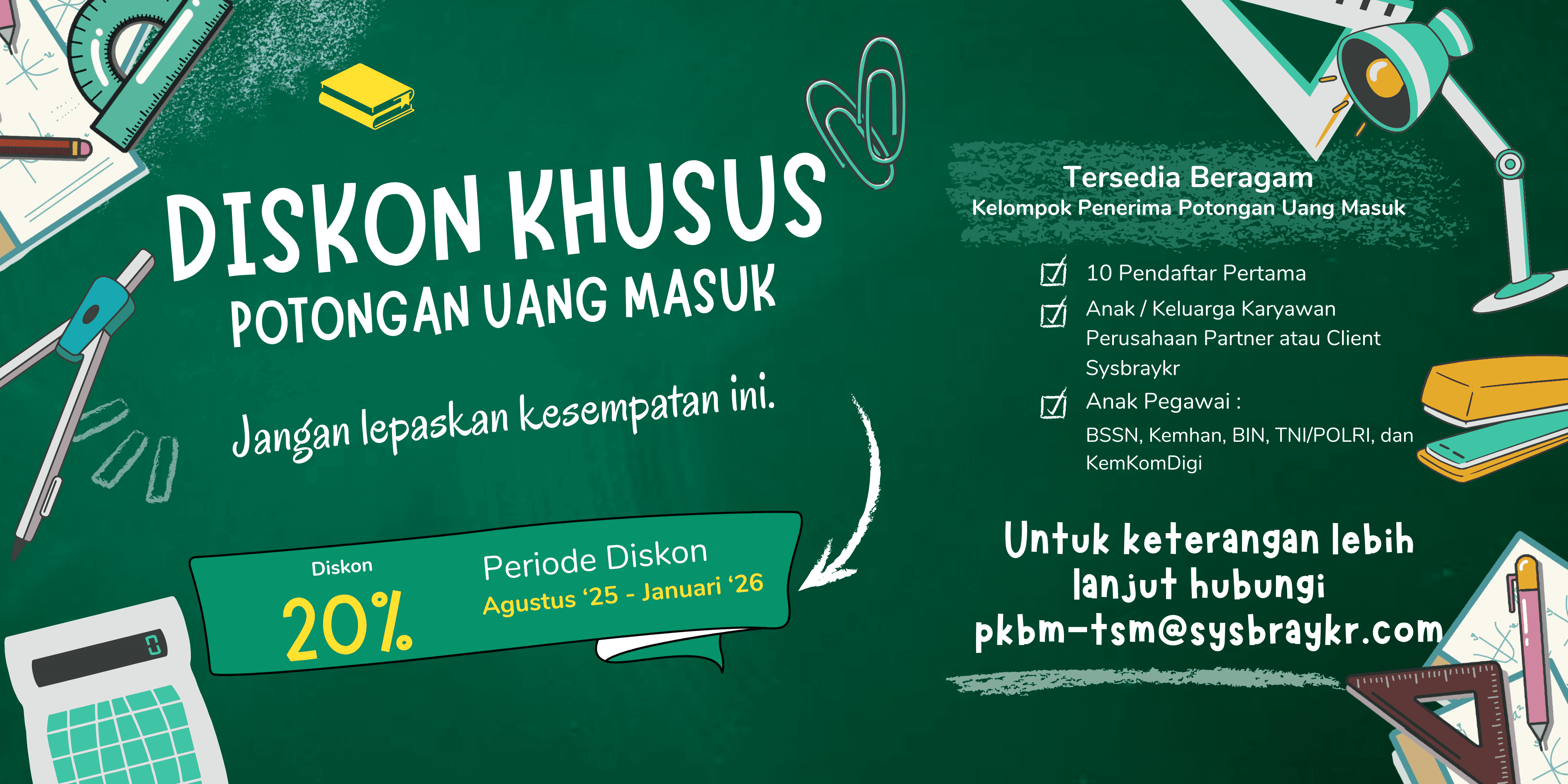 Termasuk biaya pendidikan bulanan & biaya ujian sekolah atau ujian semesteran, diluar biaya ujian khusus profesi